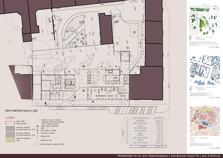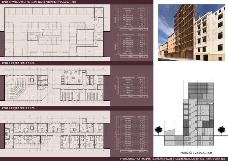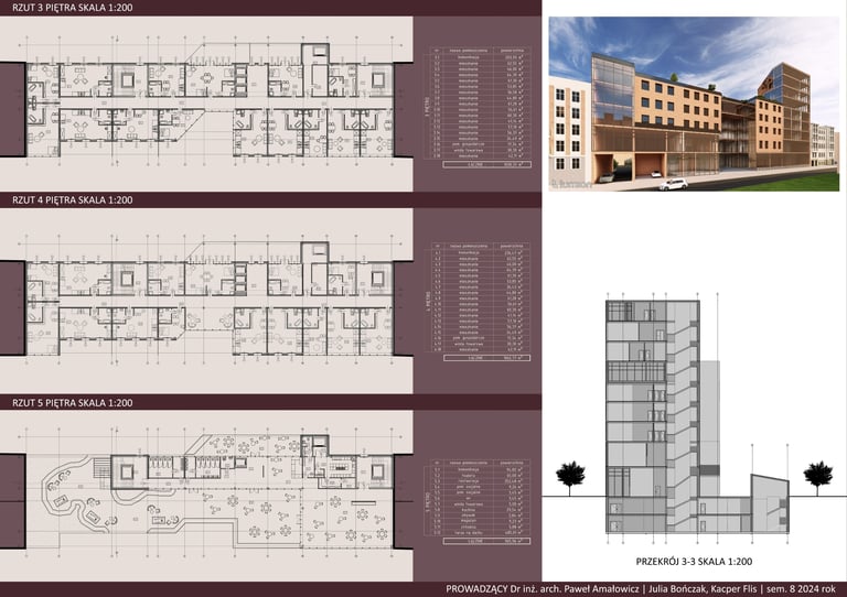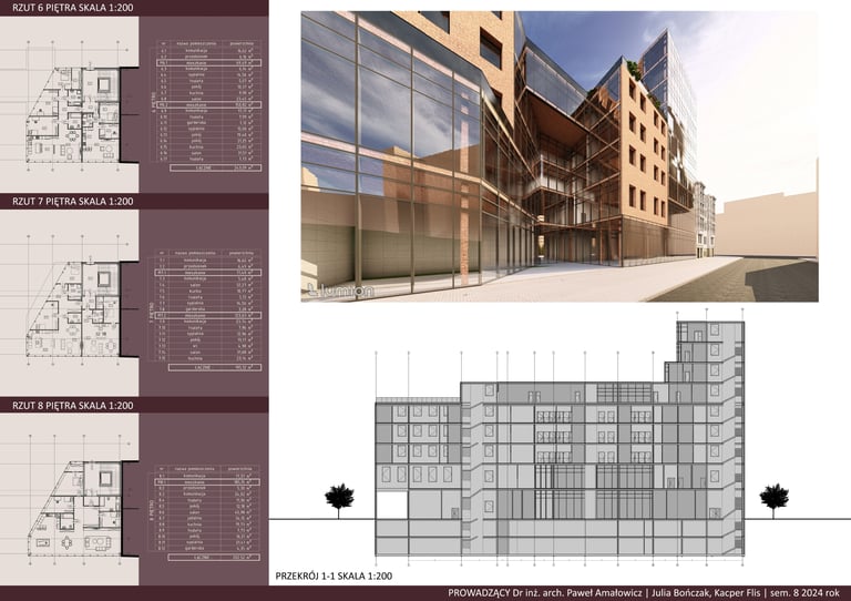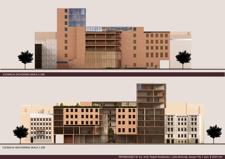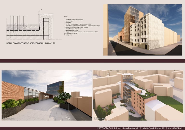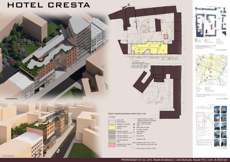 Projekt „Hotel Cresta” stanowi propozycję uzupełnienia zabudowy śródmiejskiej w formie plomby wpisanej w istniejącą strukturę kwartału. Założenie wykorzystuje potencjał trudnej, nieregularnej działki, porządkując przestrzeń i domykając pierzeje ulic, jednocześnie tworząc wewnętrzny, półpubliczny dziedziniec. Kompozycja bryły odpowiada skali otoczenia, stopniując wysokość zabudowy i podkreślając narożny akcent w postaci wyższej dominanty.